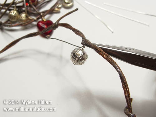 Now it's time to remove the bead stopper from the other end and thread it through the last three beads in the top section, creating a double strand of beads along the bottom of the bracelet.